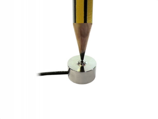 Der KM12 ist ein Membran-Kraftsensor in Ultraminiatur-Ausführung. Die Krafteinleitung erfolgt über die Kalotte im Zentrum des Sensors. Der Kraftaufnehmer wird auf eine ebene Fläche montiert. Zur Abhebesicherung kann die Aufstandsfläche mit PUR Lack auf einer ebenen Fläche fixiert werden. Aufgrund der kleinen Abmessungen wird ein Teflon Kabel mit nur 1.4mm Außendurchmesser verwendet. Alternativ zum seitlichen Kabelabgang ist eine Version mit zentralem Kabelabgang verfügbar.