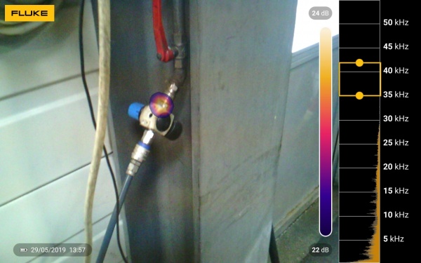 Das Leck Suchgerät in Form der industriellen Schallkamera Fluke ii905 ist in der Lage Schall in einer Frequenz von 2 bis 65 kHz mit den integrierten Mikrofonen zu empfangen und aus den Laufzeiten der Schallwellen die entsprechende Position auf dem live Videobild zu berechnen und anzuzeigen. Sie erkennt dabei an Gas-, Druckluft- und Dampfleitungen Leckagen bis 70 m (abhängig von den Umgebungsbedingungen und der Leckagegrösse).